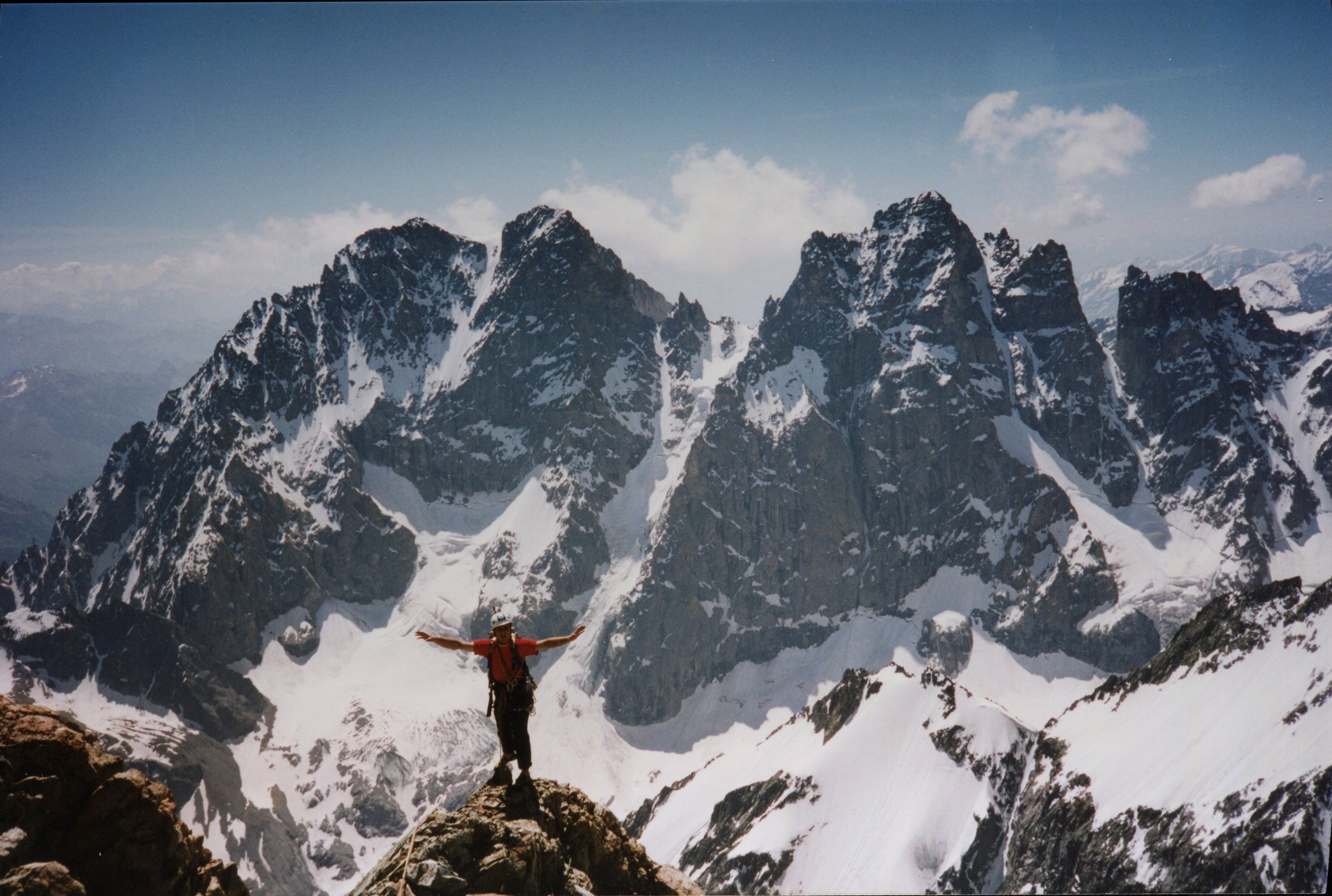 Grimpe au soleil face au chapelet des faces Nord du Glacier Noir : Pelvoux, Pic Sans Nom, Pic du Coup de Sabre